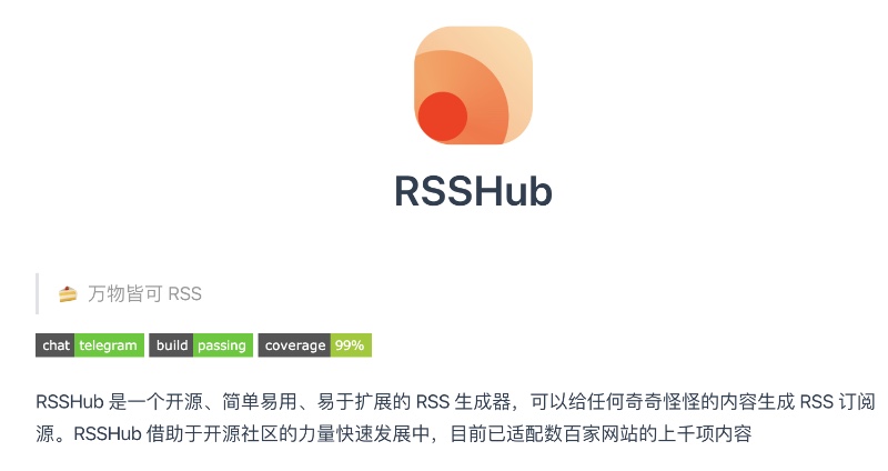 DIYgod:RSSHub 是一个用来生成 RSS 订阅源的工具,它可以给任何奇奇怪怪的内容生成 RSS 订阅源,实现万物皆可 RSS。RSSHub 正在借助于开源社区的力量快速发展中,目前已适配了数百家网站的上千项内容。使用时只需要简单的编辑下地址即可获得需要的订阅源。