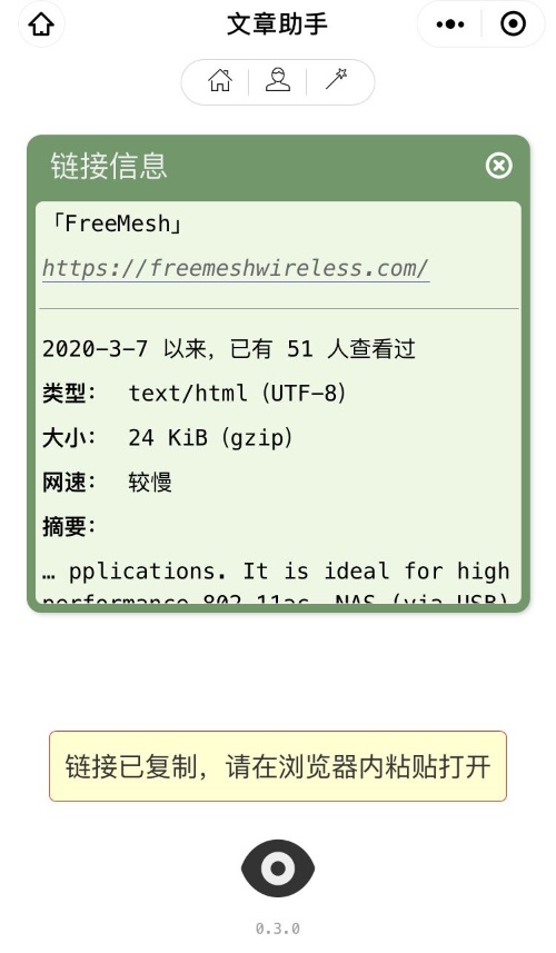 我们开发的公益小程序“文章助手”增加了一个新特性:在呈现链接时,也提供链接的更多信息,比如该链接的大小、网速和部分内容摘要。这样有助于读者在访问链接前就对该链接有所了解。