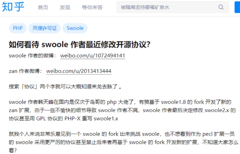 这个案例也是 2017 年的,以 Apache 许可证开源的软件 swoole(撰文时经核实 swoole 依然是 Apache 许可证),与其复刻分支版本之间纷争。