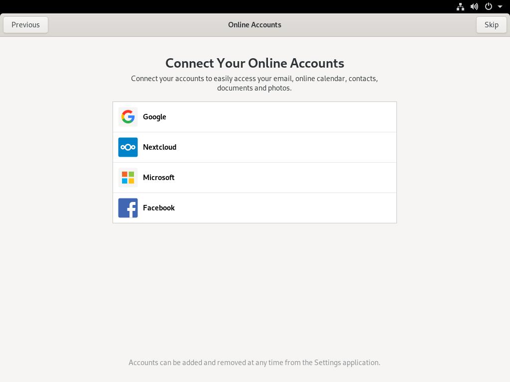 Fedora 工作站可在安装后首次启动或者之后的任何时候添加一个帐户。要在首次启动期间添加帐户,请按照提示进行操作。其中包括选择添加一个帐户: