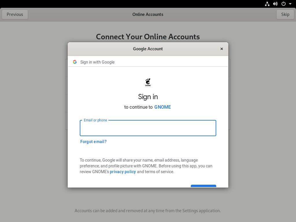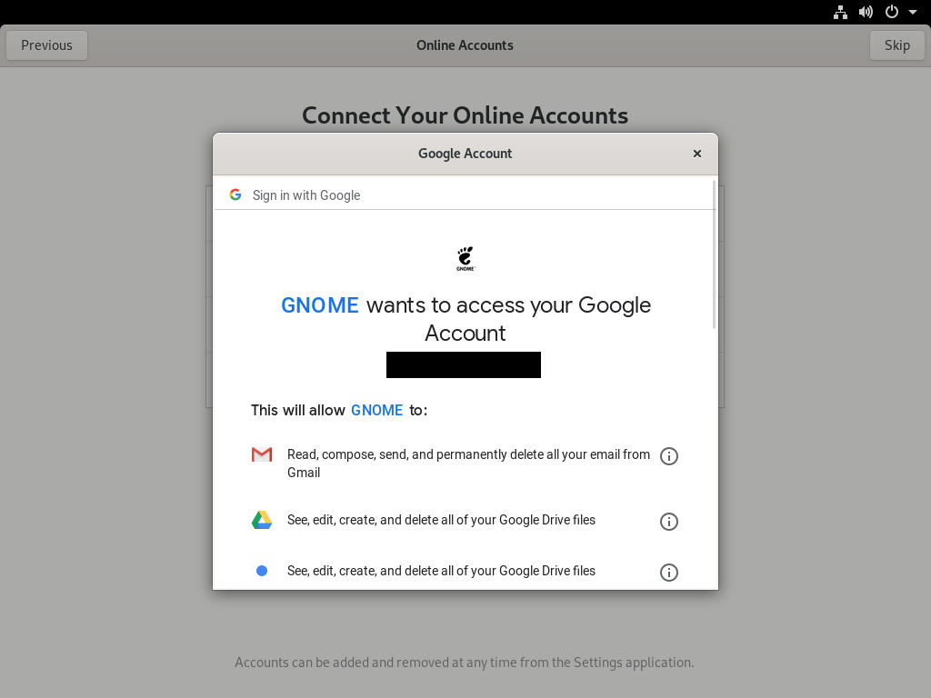 请注意,此信息仅传输给 Google,而不传输给 GNOME 项目。下一个页面要求你授予访问权限,这是必需的,以便系统桌面可以与 Google 进行交互。向下滚动查看访问请求,然后选择“允许”继续。