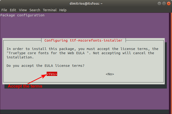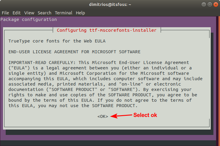 要知道尽管微软已经免费发布了其核心字体,在其它操作系统中使用该字体依然是受到限制的。在 Ubuntu 中安装微软字体前,你必须阅读并接受 EULA (最终用户许可协议) 。
