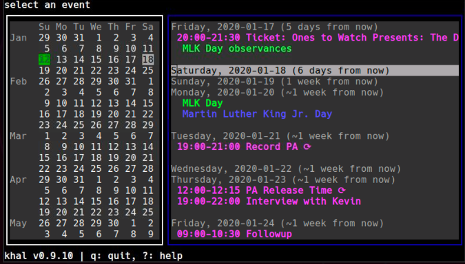 .ics文件的日历工具。 - Vdirsyncer 是一个能把线上日历(和联系人)同步到本地的终端命令。Khal 在本地运行,vdirsyncer 在远程运行,这样远程的日历能与你管理的本地日历保持同步。