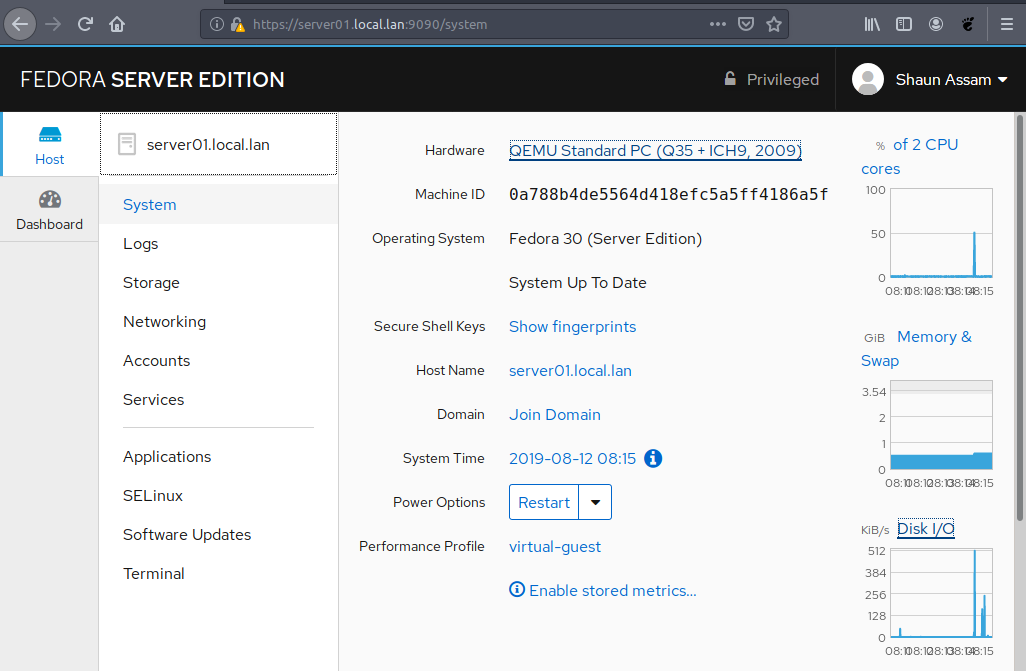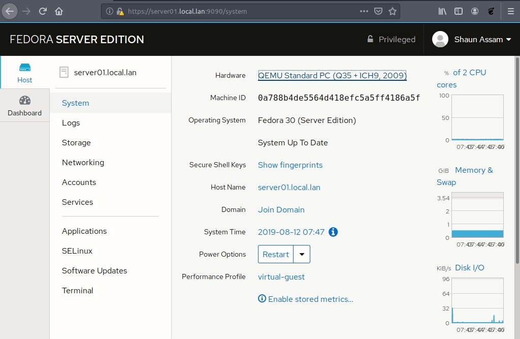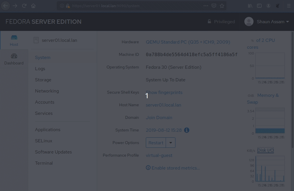 “Headless Management” 组包括了仪表盘模块(cockpit-dashboard)。它以实时图表的形式提供了 CPU、内存、网络和磁盘性能的概览。远程服务器也可以通过同一界面进行添加和管理。