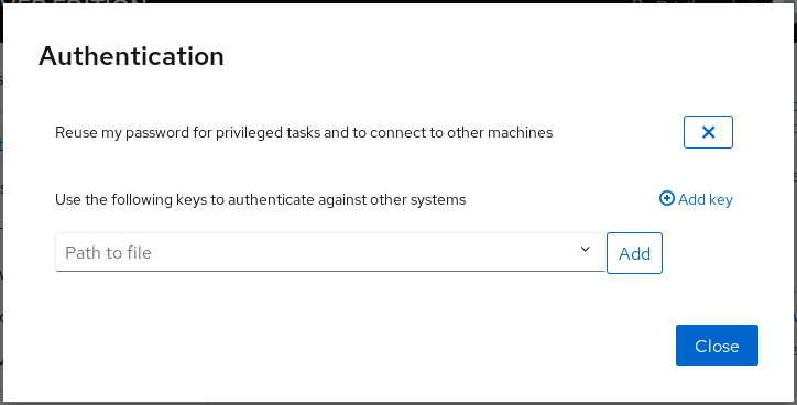 你也可以通过点击右上角的用户名,选择“验证”,添加自己的密钥。点击 “添加密钥”,可以在其他系统上验证该机器。你也可以通过点击右侧的 “X” 按钮,撤销你在 Cockpit Web 服务中的权限。