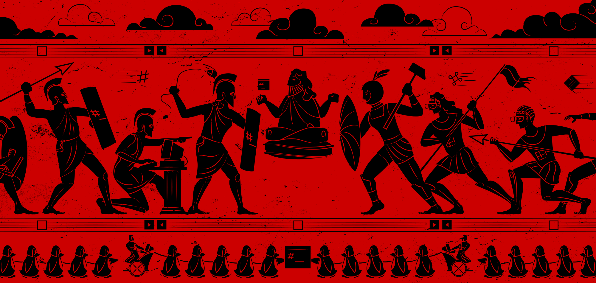 00:23:30 - Saron Yitbarek: 在技术的西部荒野,一贯如此。苹果受到施乐的启发,微软受到苹果的启发,Linux 受到 UNIX 的启发。进化、借鉴、不断成长。如果比喻成大卫和歌利亚(LCTT 译注:西方经典的以弱胜强战争中的两个主角)的话,开源软件不再是大卫,但是,你知道吗?它也不是歌利亚。开源已经超越了这些角色,它成为了其他人战斗的战场。随着开源变得不可避免,新的战争,那些在云计算中进行的战争,那些在开源战场上进行的战争正在加剧。