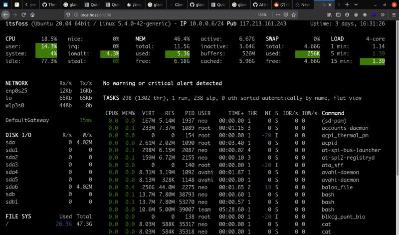 最主要的是它使用的是 61208 端口号,你可以用它来通过网络浏览器访问 Glances。只要在服务器的 IP 地址后面输入端口号,比如 http://123.123.123.123:61208。