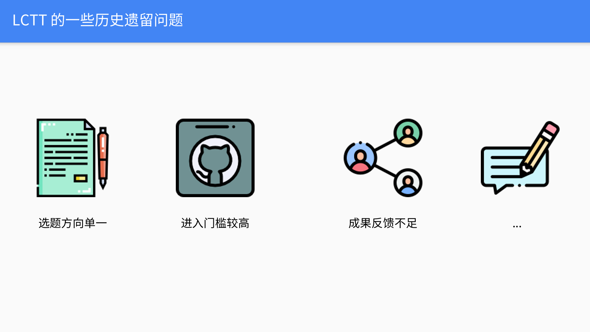 其实,在过去的一年里,LCTT 的问题在不断的浮现:选题方向单一、译者进入门槛较高、大家翻译的质量水平参差不齐、校对的人手不足、译稿外发的反馈不足,这些问题都是我们在过去遇见,但一直没有足够的精力和人力来解决的问题。不过,如今我将加入到 LCTT 的管理团队中,配合老王,一起一个个的解决这些过去遇见的问题。