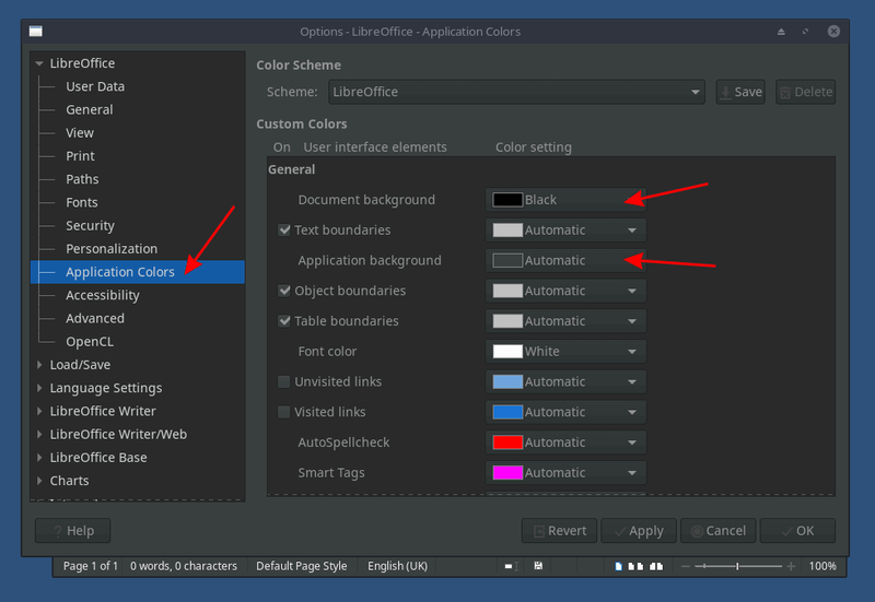 接下来,打开套件中的任意 LibreOffice 应用,例如 Writer。然后从菜单中,依次点击 Tools -> Options -> Application Colors,然后选择 Document background 和 Application background 为 Black 或 Automatic(任意适合你的方式)。