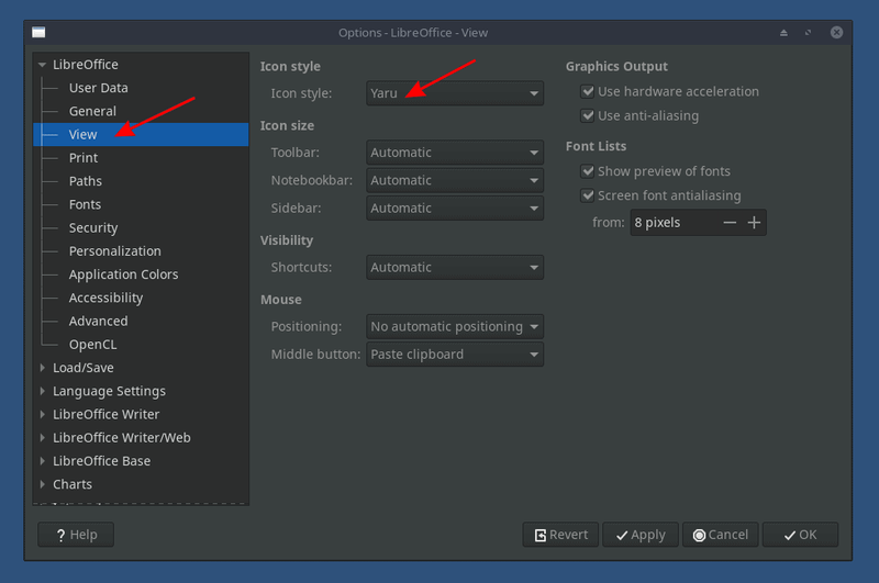如果图标不是深色,那么可以从菜单(如下图所示)中更改它们,Tools -> Options -> View ,我在 MX Linux 上的个人选择是 Ubuntu 的 Yaru 图标样式(如果你使用的图标包为深色版本,请选择它) 。