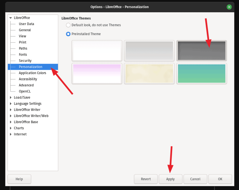 如果你使用的是 LibreOffice 套件的 Flatpak 软件包,那么 LibreOffice 的标题区域(或菜单区域)可能看起来是白色的。在这种情况下,你可以尝试进入 Tools -> Options -> Personalization,然后选择 “灰色主题”,如下截图所示。